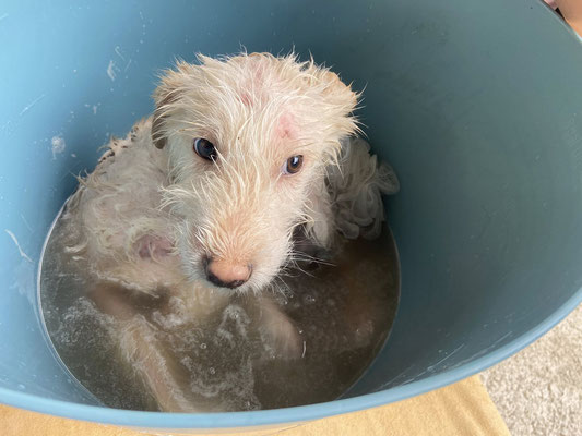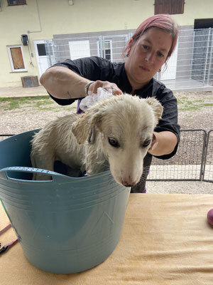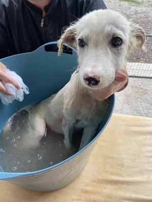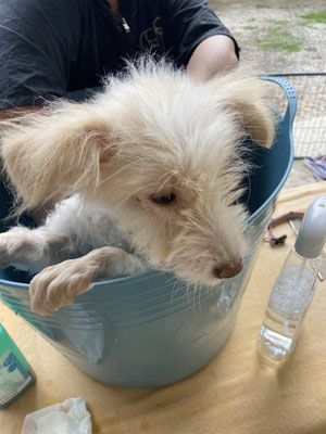 SUSI legte sich richtig ins warme Wasser. Susi - Haut und Knochen und gerade mal 3,2 kg schwer!